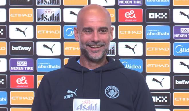新闻发布会正式开始前,瓜迪奥拉和现场记者开起了玩笑。