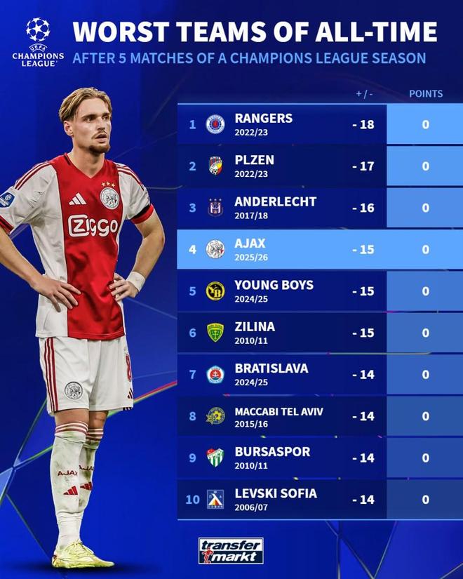北京时间11月26日,在欧冠联赛阶段第5轮的比赛中,阿贾克斯主场0-2不敌本菲卡,目前5战全败仅进1球丢16球排名垫底,对此德转列出了欧冠历史单赛季前5场过后成绩最差的10支球队,本赛季的阿贾克斯排名第四,2022-23赛季的格拉斯哥流浪者位列第一。